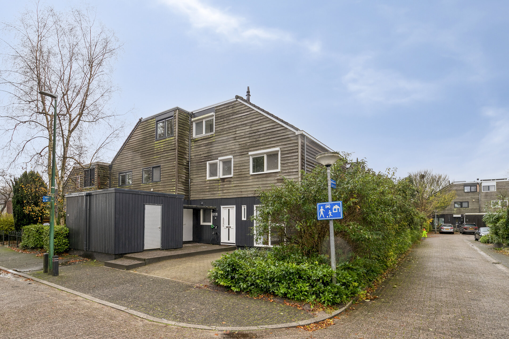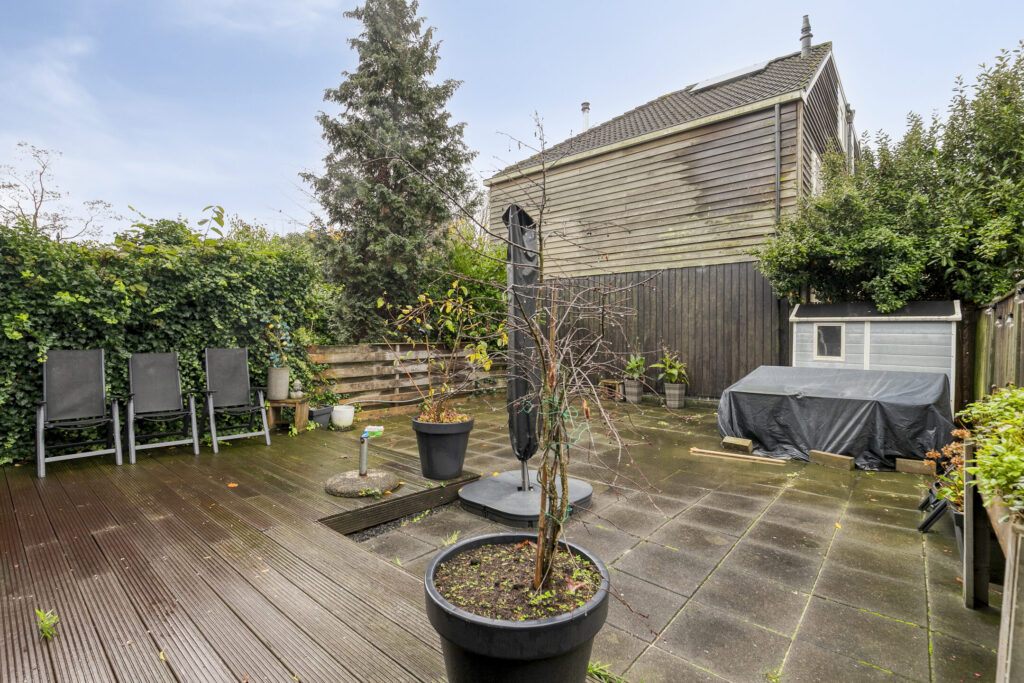 De achtertuin is royaal en volledig gericht op gemak en privacy. Het eerste deel bestaat uit een vlonderplankenterras waar je in de zomer heerlijk kunt loungen, terwijl het betegelde gedeelte achterin voldoende ruimte biedt voor een grote tafel, een trampoline of meerdere zithoeken. Door de hoekligging heb je nauwelijks inkijk en kun je vrij bewegen en genieten. De tuin vraagt weinig onderhoud, maar biedt wél volop mogelijkheden voor groen, moestuinbakken of een veranda. Aan de voorzijde vind je een eigen oprit en een praktische berging voor fietsen en gereedschap — ideaal voor dagelijks gebruik.