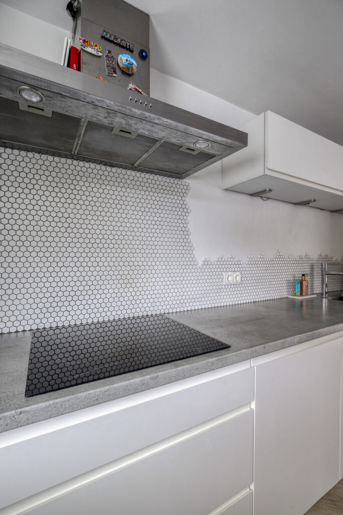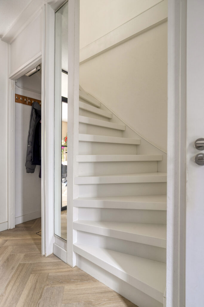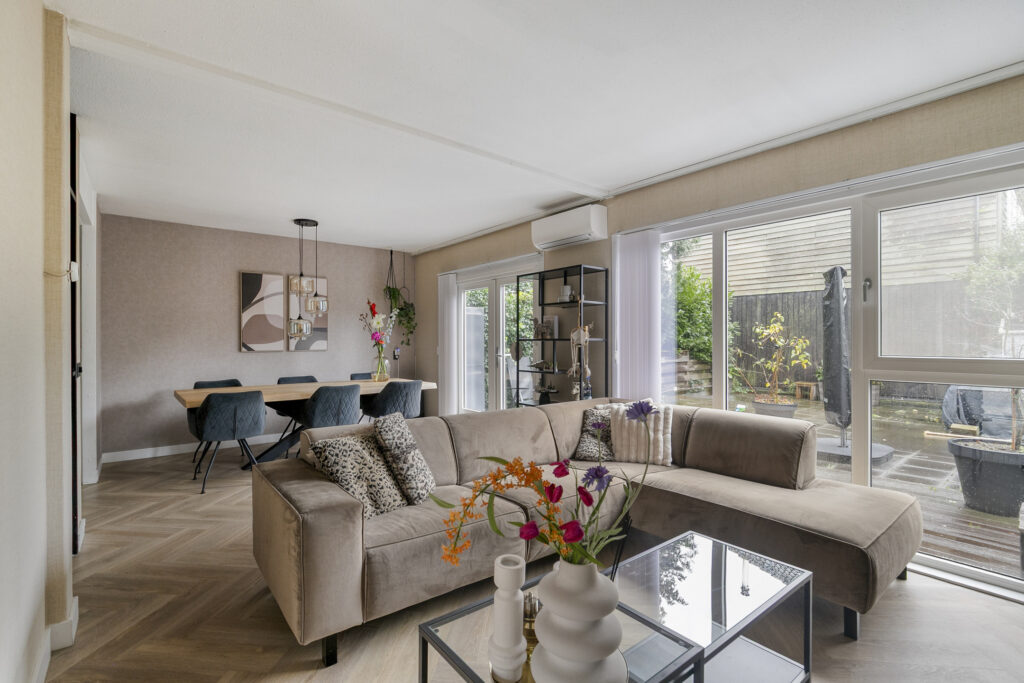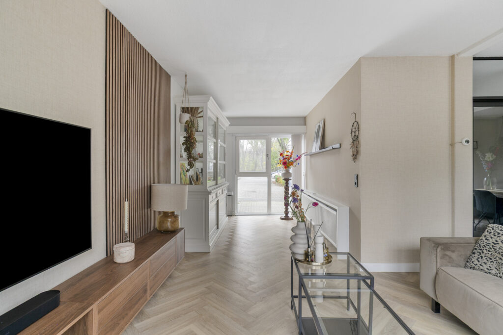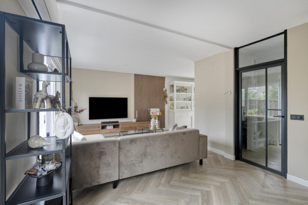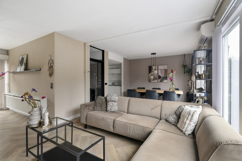 Je stapt binnen in een frisse, lichte hal met toegang tot het modern afgewerkte toilet, garderobe en de trapopgang. Door de moderne stalen deur loop je de verrassend ruime woonkamer binnen, waar de glazen pui en openslaande tuindeuren direct de aandacht trekken. De zithoek voelt uitnodigend door de rustige kleuren, de akoestische wandpanelen tegen de wand en het doorlopende visgraatmotief op de vloer. De aanwezige airconditioning zorgt voor een aangename temperatuur. Aan de andere zijde ligt de eethoek, ruim genoeg voor een lange tafel en mooi in contact met de keuken. Die keuken is strak en minimalistisch uitgevoerd in wit met betonlook werkblad, en beschikt over een inductiekookplaat, afzuigkap, combi-oven, koel-/vriescombinatie en een vaatwasser. Door het langgerekte ontwerp heb je veel werkruimte zonder dat je inlevert op bewegingsvrijheid.