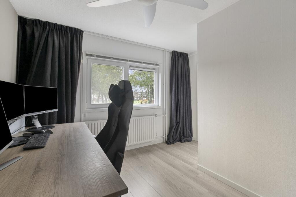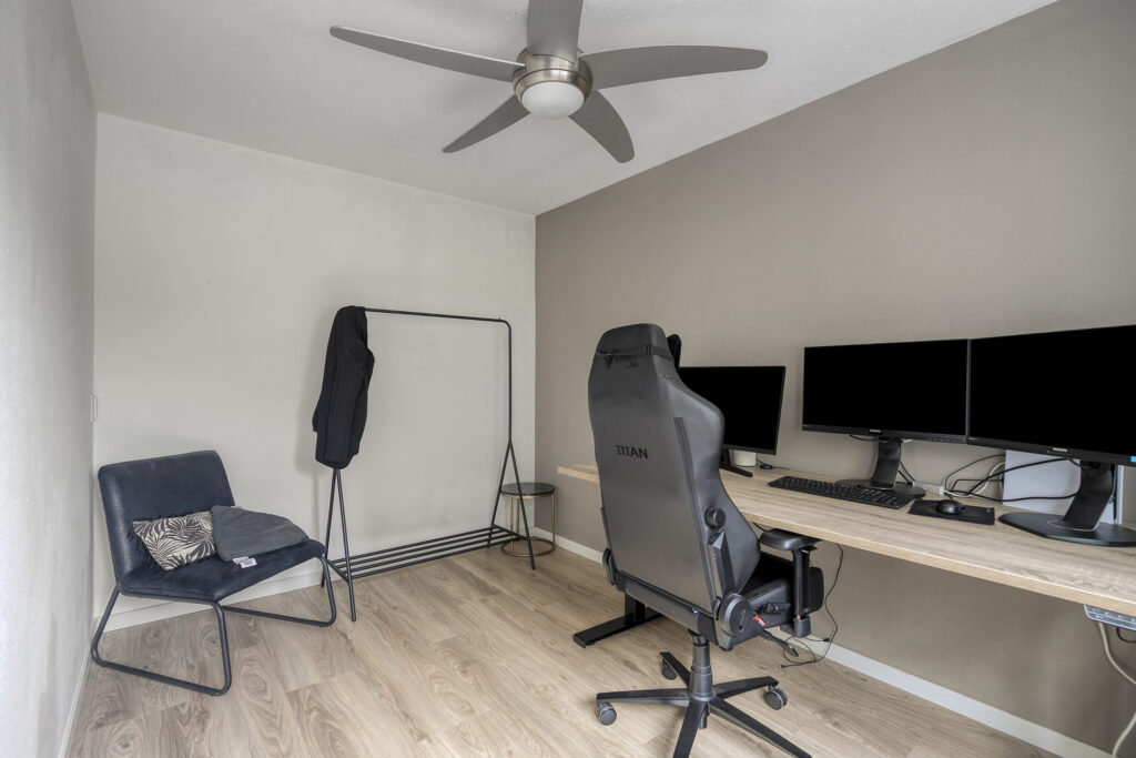 De tweede verdieping is verrassend groot en praktisch ingedeeld. Momenteel is dit één royale ruimte die dienstdoet als slaapkamer en werkplek, maar de opties zijn eindeloos: een riante slaapkamer, twee aparte kamers, een gameroom of een atelier. De grote ramen zorgen voor licht, de airco voor een aangename temperatuur, en de vaste kasten en extra opbergruimte maken deze verdieping bijzonder functioneel. De ruimte is uitgerust met de witgoedaansluitingen, een dubbele gootsteen en volop bergruimte.