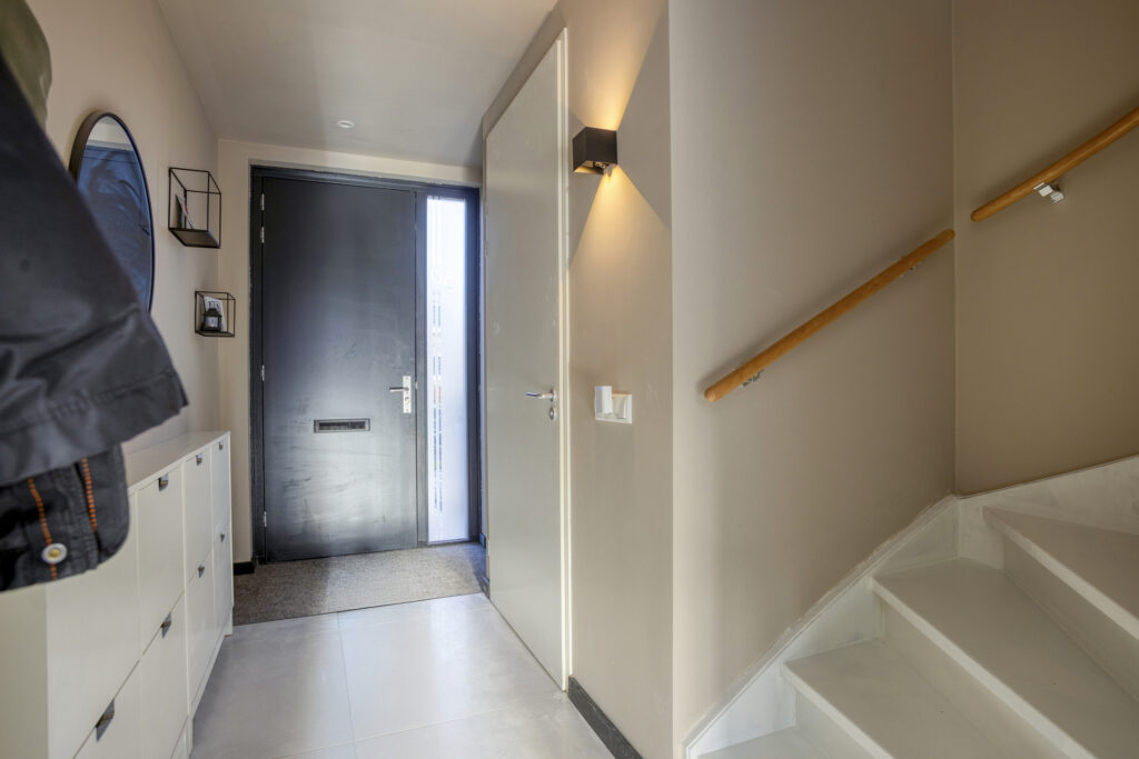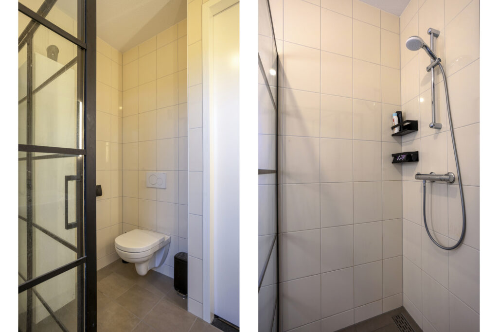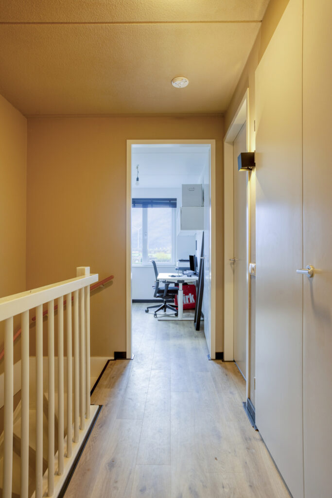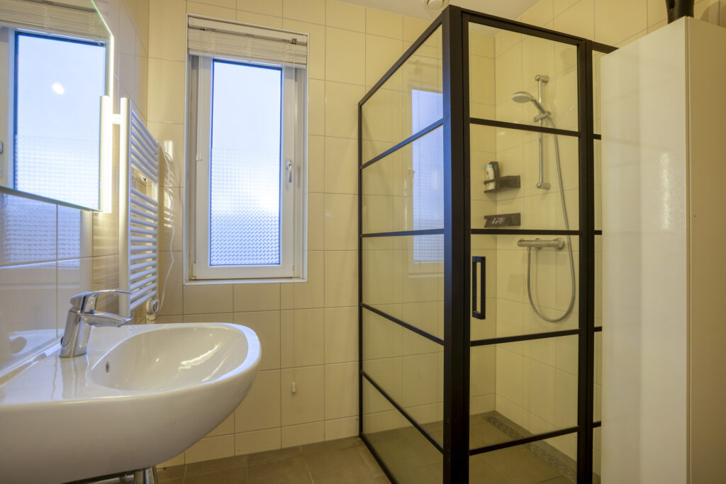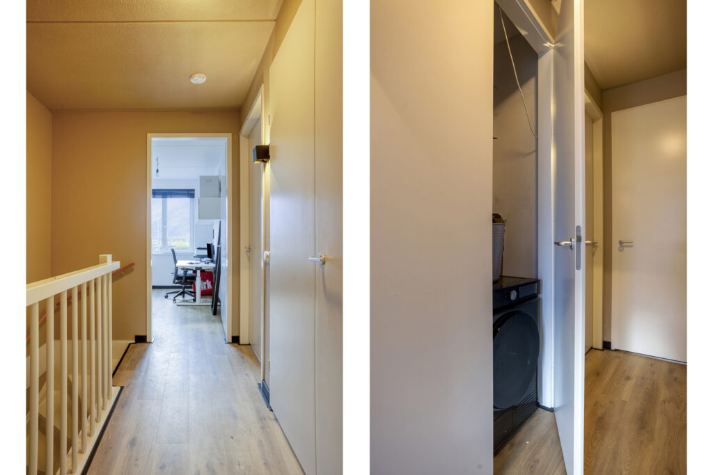 De overloop verbindt een tweetal bergkasten en drie slaapkamers die stuk voor stuk prettig van formaat zijn. De grootste kamer aan de achterzijde heeft een rustige uitstraling en biedt ruimte voor een groot bed én kastenwand. De twee overige kamers zijn ideaal als kinder- of werkkamer. De badkamer bevindt zich aan de voorzijde en is uitgerust met een ruime douche, wastafel en wandcloset. De combinatie van lichte en betonlook tegels, en een moderne afwerking, zorgt voor een frisse uitstraling.