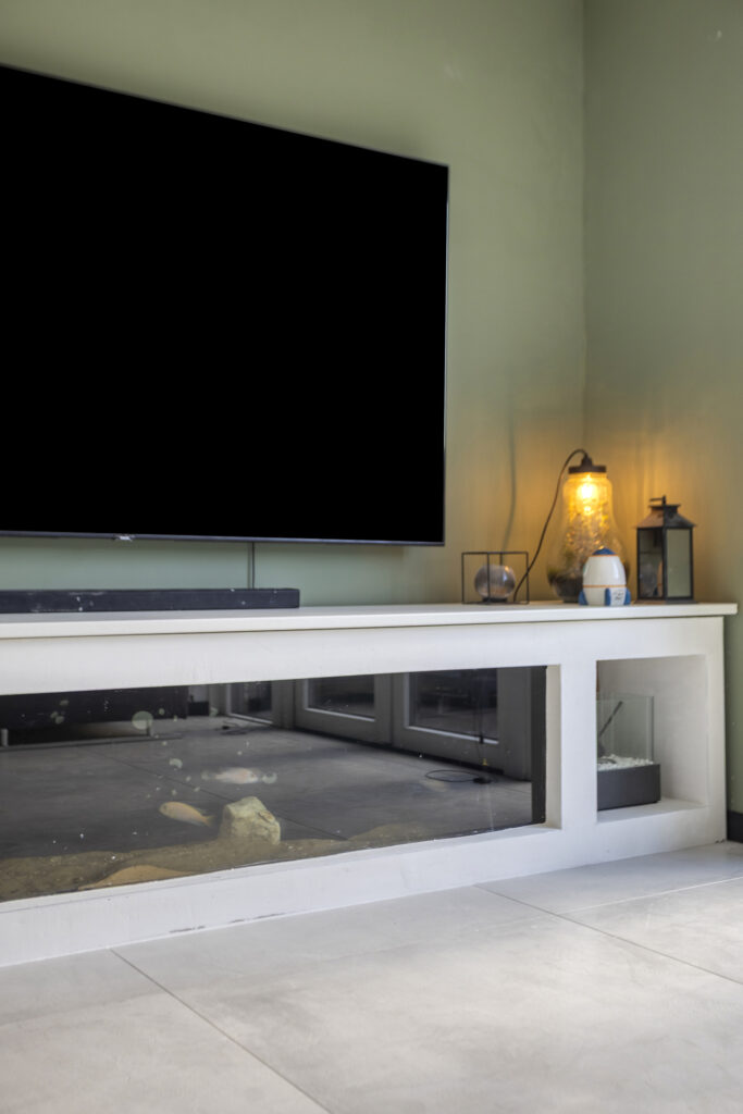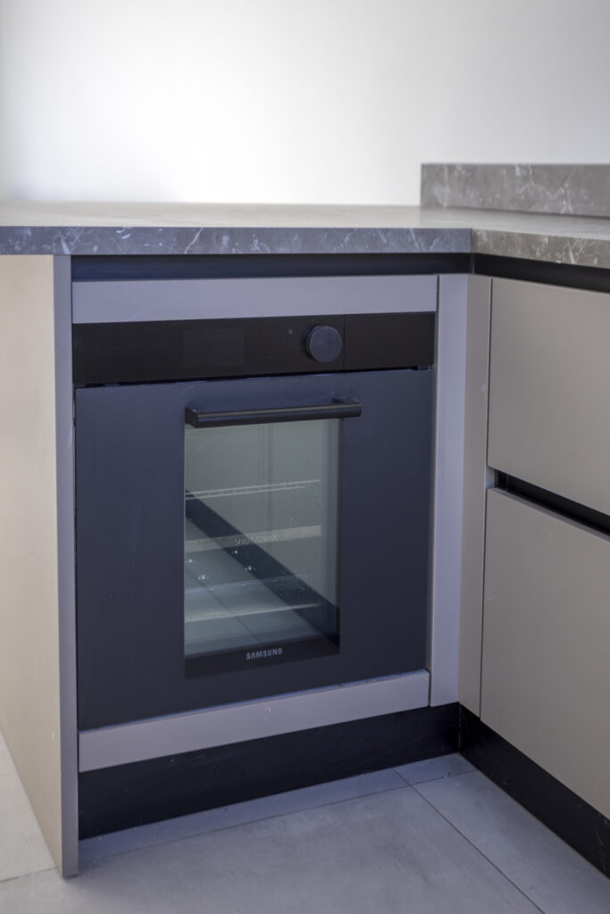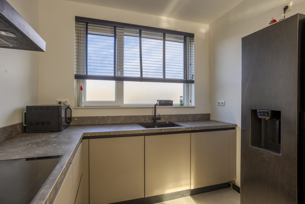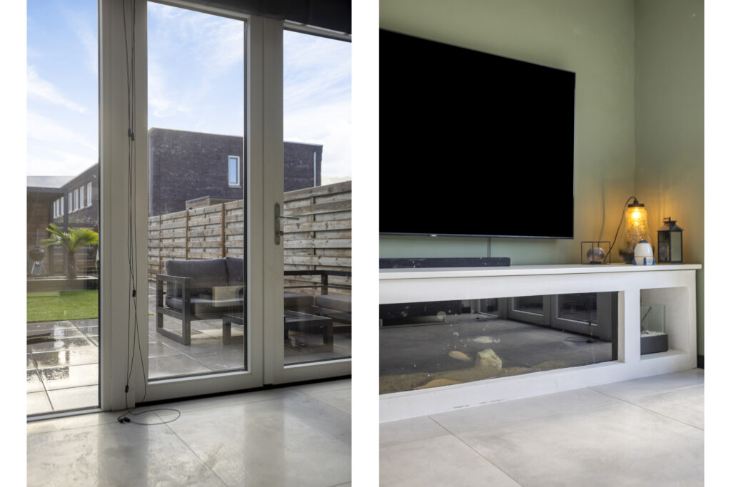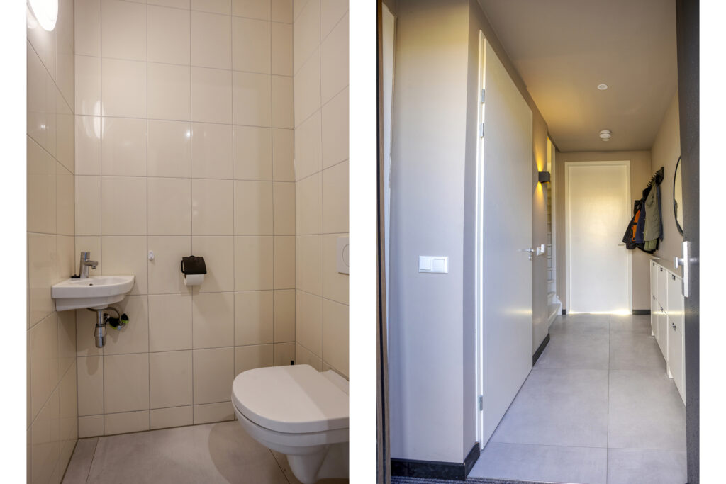 Via de nette voortuin stap je binnen in de lichte entree, met meterkast, modern toilet en trapopgang, waar de hal je door leidt naar het leefgedeelte. De woonkamer voelt ruim door de grote raampartij, met openslaande tuindeuren, die bijna de volledige achterwand beslaat en een directe verbinding geeft met de tuin. De grote betonlook vloertegels, strakke wanden en rustige kleurtinten creëren een moderne basis waarop je gemakkelijk jouw eigen stijl legt. Aan de voorzijde ligt de keuken, uitgevoerd in een U-opstelling met brede werkbladen, een schiereiland en moderne apparatuur zoals een inductiekookplaat, afzuigkap, vaatwasser en combi-oven. De ruimte is praktisch ingedeeld en biedt plaats voor zowel koken als gezellig aan de ontbijtbar zitten. De begane grond vormt een fijne, open leefruimte waar licht en comfort de boventoon voeren. Extra opbergruimte, voor bijvoorbeeld voorraad, vind je in de diepe trapkast.