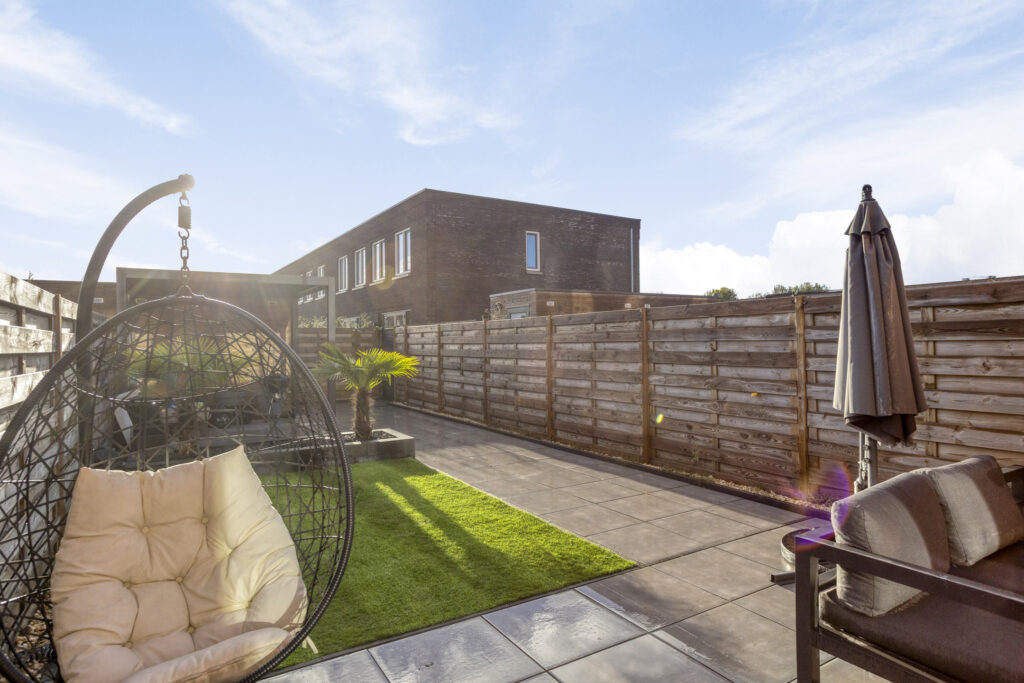De achtertuin is een absoluut pluspunt: strak aangelegd, diep, onderhoudsvriendelijk en ingericht met grote tegels en gazon voor een frisse uitstraling. De twee palmen geven de tuin een verrassend zomerse touch. Achter in het perceel staat een praktische berging en een stalen overkapping – heerlijk voor een loungeset of een barbecueplek die het hele jaar bruikbaar blijft. Dankzij de vrije ligging en royale lengte heb je hier alle ruimte om te ontspannen, te spelen of vrienden uit te nodigen voor gezellige zomerse avondjes buiten. Via de achterom heb je makkelijke toegang tot de tuin.