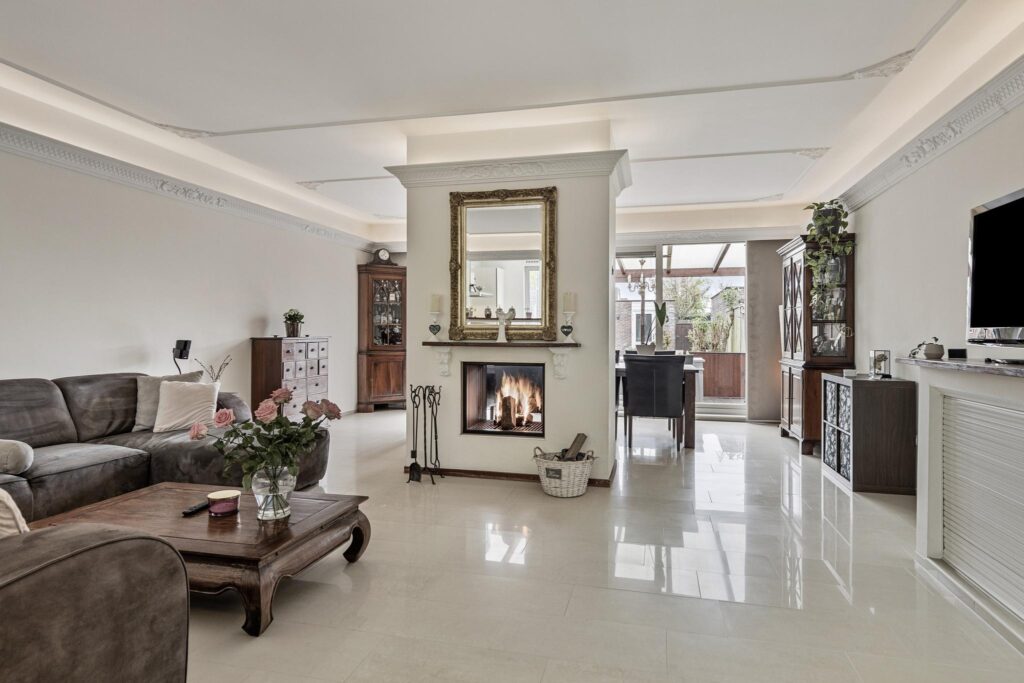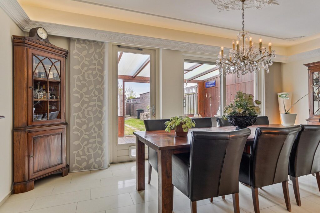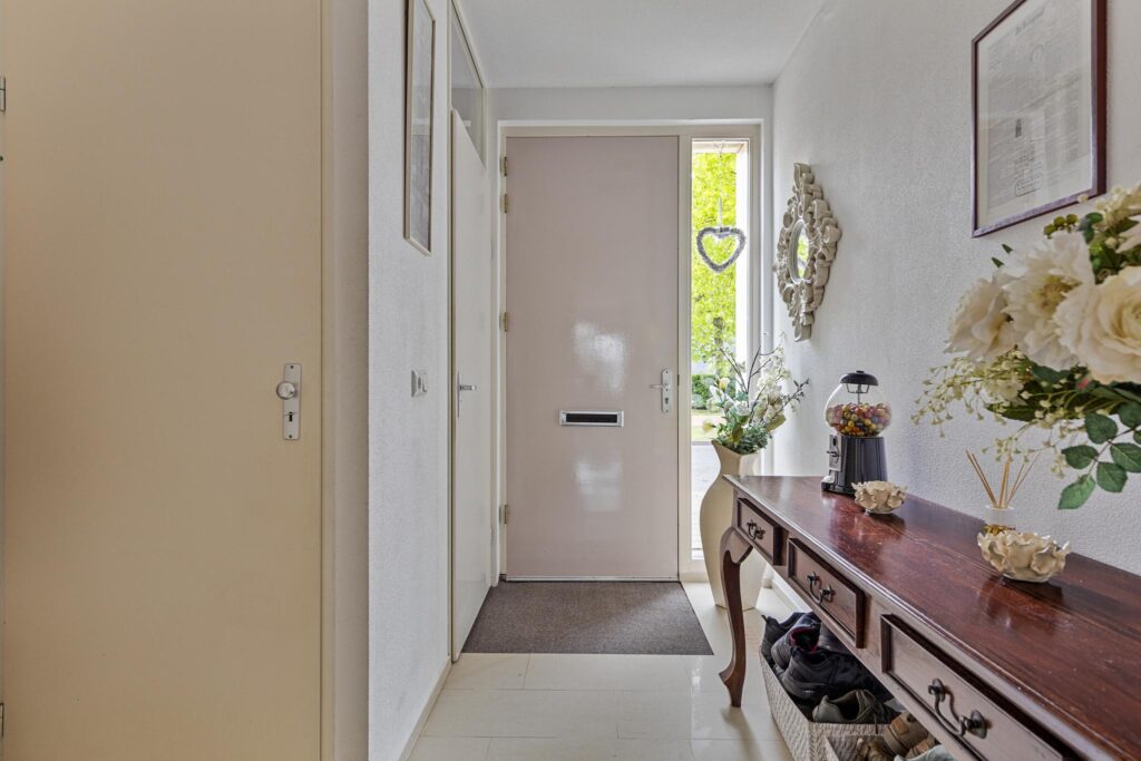 Bij binnenkomst ervaar je direct de ruimte: de lichte hal met toilet en meterkast leidt naar de open woonkamer met sfeervolle divider inclusief haard. De eethoek grenst aan de serre; een fijne overgang naar de tuin. De woonkamer sluit aan op de moderne, L-vormige open keuken aan de voorzijde, compleet met inbouwapparatuur zoals inductiekookplaat, oven, vaatwasser en veel opbergruimte.