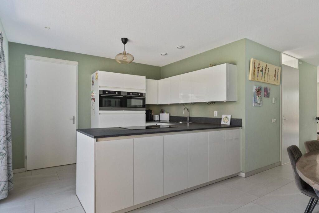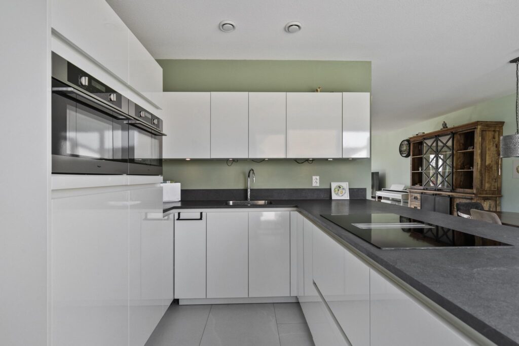 De woonkamer is gelegen aan de voorzijde en valt op door de indrukwekkende raampartijen die tot aan de vloer reiken. Het zicht op de rustige straat en het park geeft een prettig gevoel van ruimte en vrijheid. Aan de achterzijde vind je de eetkamer en de moderne, open keuken. Deze is uitgevoerd in een lichte U-opstelling met schier-kookeiland, en een contrasterend donker werkblad. De keuken beschikt over hoogwaardige apparatuur, waaronder een inductiekookplaat met geïntegreerde afzuiging, combi-oven, stoomoven, vaatwasser, koelkast, vrieskast en veel bergruimte. Dankzij de schuifpui stap je hier zo de tuin in. Extra pluspunt is de aparte kamer grenzend aan de keuken; deze is perfect als speelruimte, werkkamer, atelier of bijkeuken. De kamer is voorzien van openslaande tuindeuren, waardoor je ook hier geniet van veel lichtinval. Via de hal bereik je ook een praktische berging, met deur naar de voorzijde.