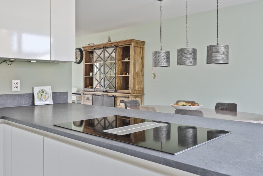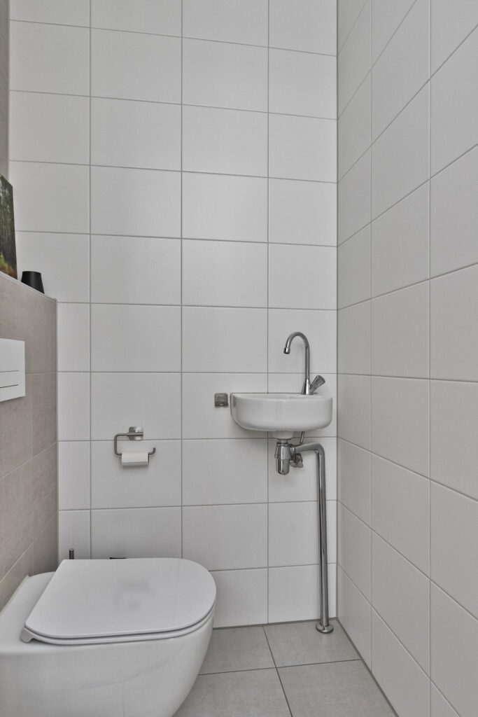 Via de ruime hal met meterkast, modern toilet, trapopgang en trapkast betreed je de woning. De vloer is afgewerkt met grote, betonlook plavuizen die naadloos doorlopen in de woonkamer en keuken – stijlvol én praktisch.