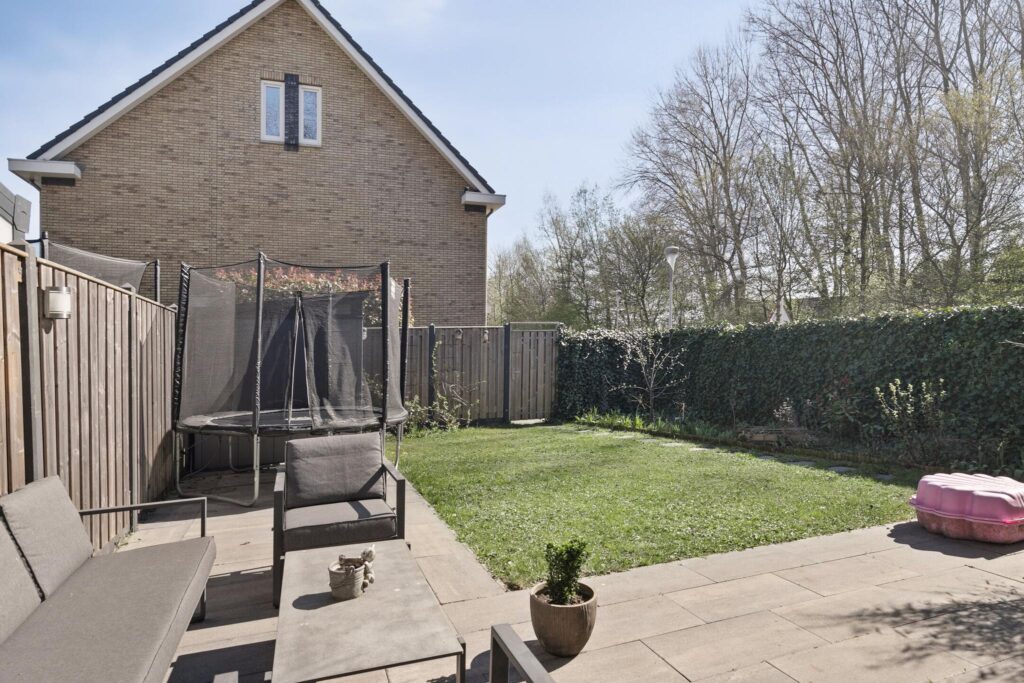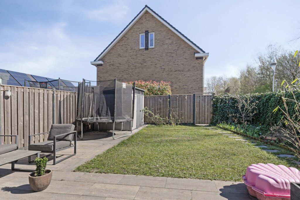 De zonnige achtertuin is vrij diep en biedt dus vrijwel de hele dag zon. Je vindt er een royaal terras, een stuk gazon en meerdere borders met beplanting. Door de ligging op de hoek is de tuin breder dan gemiddeld en voelt heerlijk vrij. Dankzij de hoge, groene erfafscheiding heb je volop privacy – ideaal om in alle rust te ontspannen, te spelen of gasten te ontvangen. Aan de voorzijde beschik je over parkeergelegenheid op eigen terrein en een gezellige voortuin, waar je ook van de zon kunt genieten.
