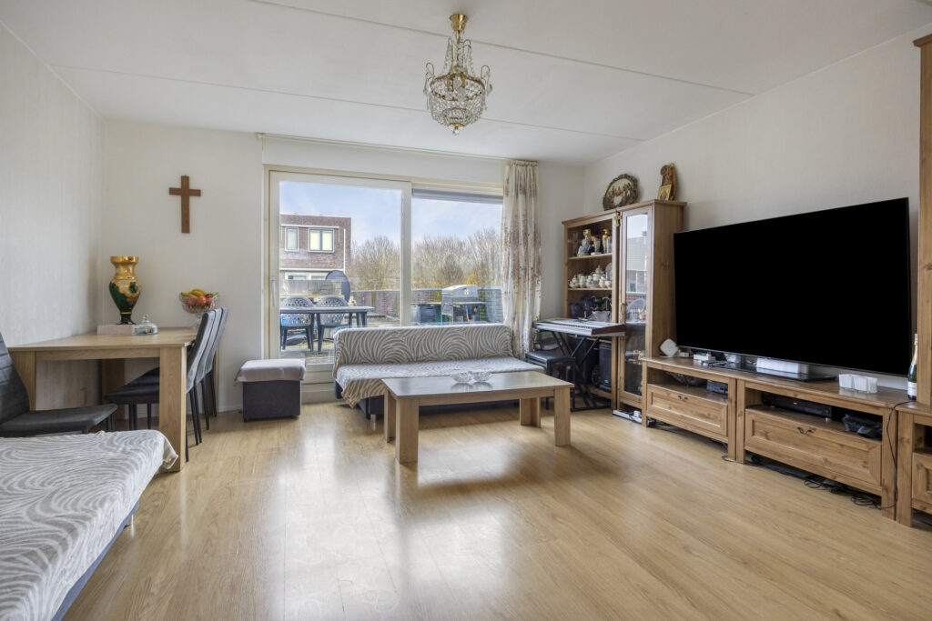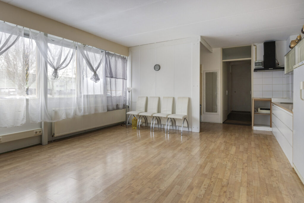 Centraal op de begane grond bevindt zich de lichte woonkamer met open verbinding naar de keuken. De open indeling creëert een ruimtelijk gevoel en laat het daglicht vrij door de ruimte stromen. De keuken is voorzien van een langwerpig aanrechtblad met spoelbak, een losstaande koelkast en vriezer. Hoewel functioneel, biedt deze keuken alle ruimte om geheel naar eigen smaak te moderniseren en uw culinaire wensen tot leven te brengen.