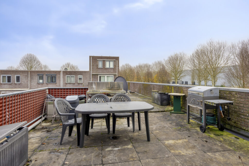 Het dakterras is toegankelijk via de schuifdeur in de woonkamer en vormt een heerlijk verlengstuk van uw leefruimte. Hier geniet u van rust, privacy en buitenlucht, ideaal voor een kop koffie in de ochtendzon of een ontspannen moment aan het einde van de dag.