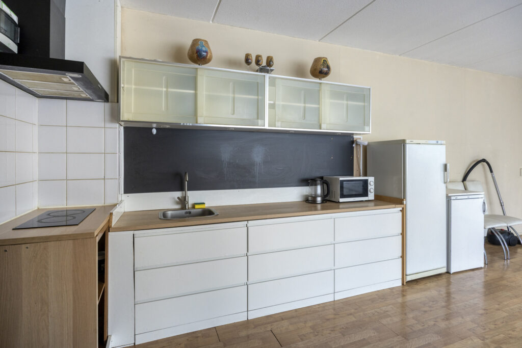De keuken aan de voorzijde is uitgevoerd in een praktische U-vorm en voorzien van een inductiekookplaat, ovencombinatie, vaatwasmachine, spoelbak, koelkast en voldoende kast- en lade-opbergruimte. De keuken is instapklaar, maar kan uiteraard desgewenst worden gemoderniseerd om volledig te voldoen aan uw eigen woonwensen.