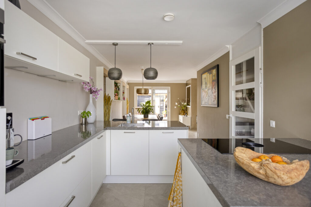 Aan de voorzijde van de woning kunt u op eigen terrein parkeren en heeft u de mogelijkheid om een elektrische auto op te laden door middel van de aangebrachte laadpaal. Via de overkapte entree kom je in de hal met toilet, trapopgang en toegang tot de leefruimte. Aan de voorzijde ligt de keuken, uitgevoerd in een moderne opstelling met veel werk- en kastruimte. Het kookeiland vormt een praktisch middelpunt en zorgt voor een directe verbinding met de eetkamer. De hoogwaardige apparatuur bestaat uit een Bora inductiekookplaat met geïntegreerde downdraft afzuiging, combi-oven, een tweede oven, vaatwasser, Quooker en koel- en vrieskast.