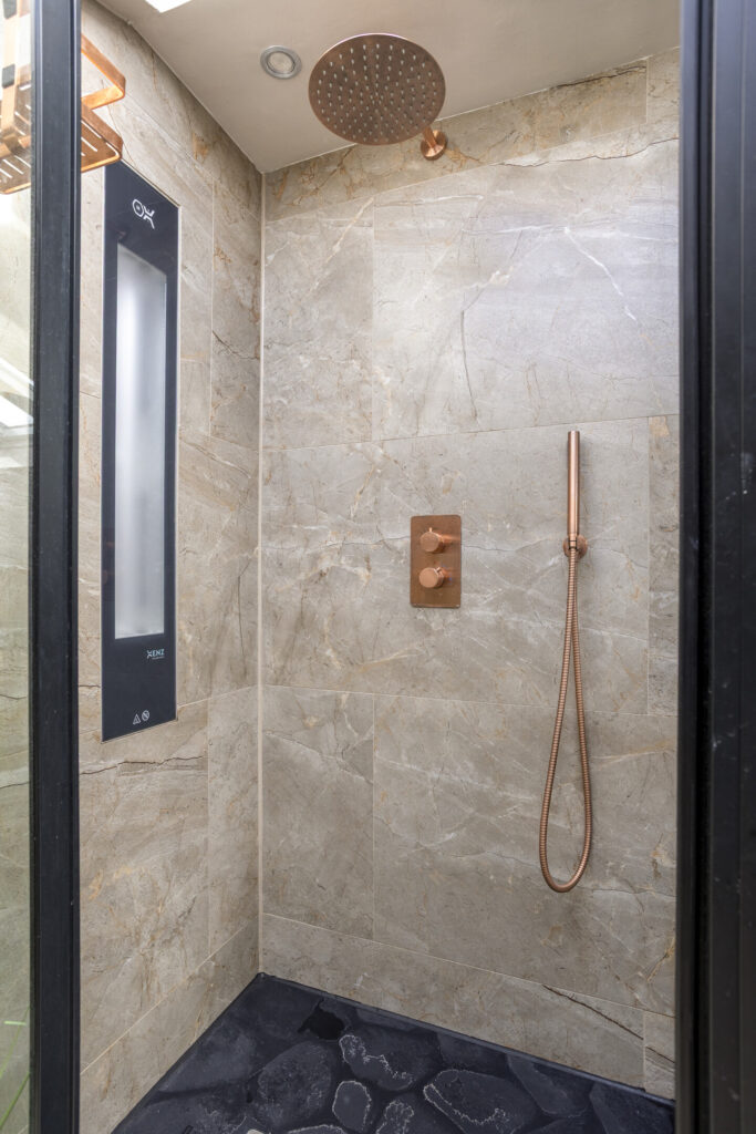 De tweede verdieping biedt extra leefruimte: een vijfde royale slaapkamer met een ruim dakterras en een badkamer en suite (2024). Deze badkamer is luxe uitgevoerd en beschikt over een ligbad, inloopdouche met infrarood sunshower en een wastafelmeubel. In de slaapkamer is extra bergruimte aanwezig, handig voor het opbergen van spullen die niet dagelijks nodig zijn.
