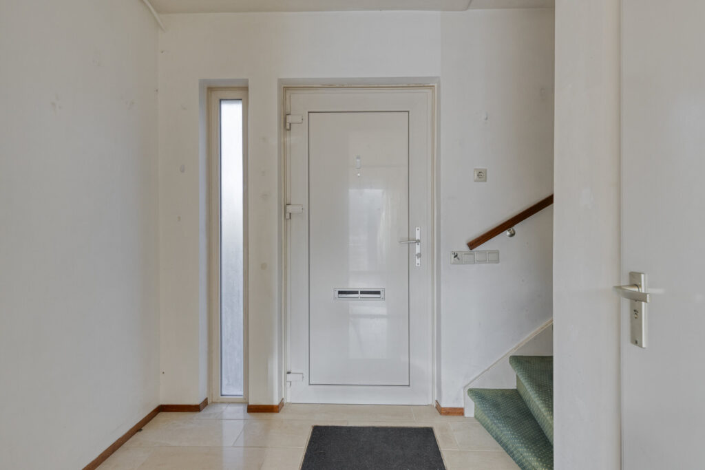 Via de nette voortuin bereikt u de entree van de woning, waar zich ook de externe berging bevindt, ideaal voor fietsen of tuinspullen. Eenmaal binnen komt u in de hal, die toegang biedt tot de toiletruimte, de trap naar de eerste verdieping en de woonkamer. De hal vormt een prettige binnenkomst en geeft direct een verzorgd en overzichtelijk gevoel.