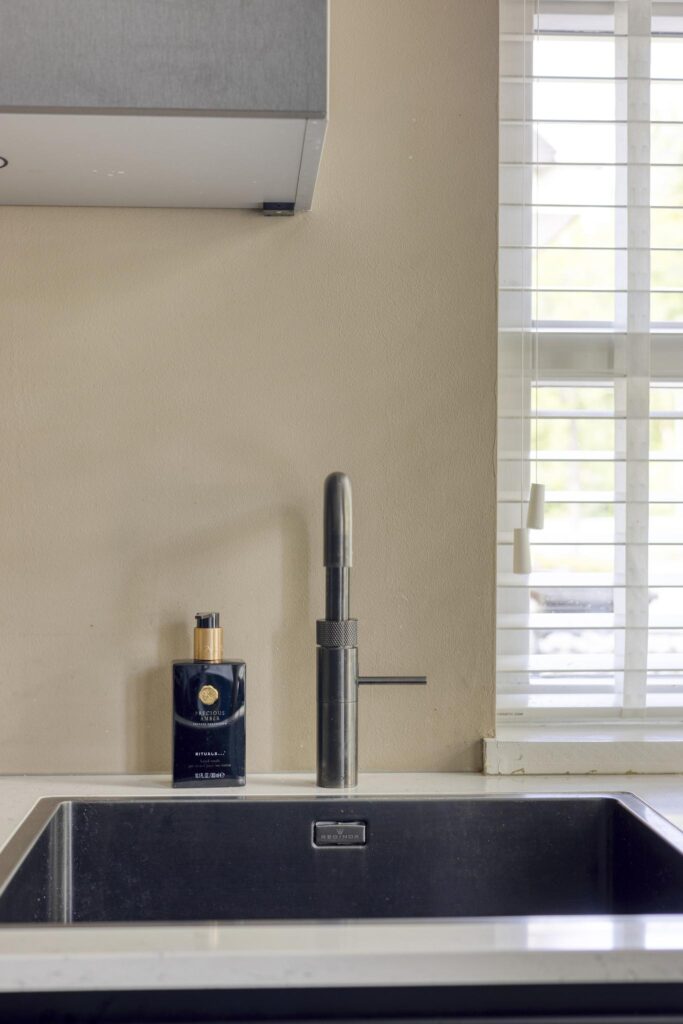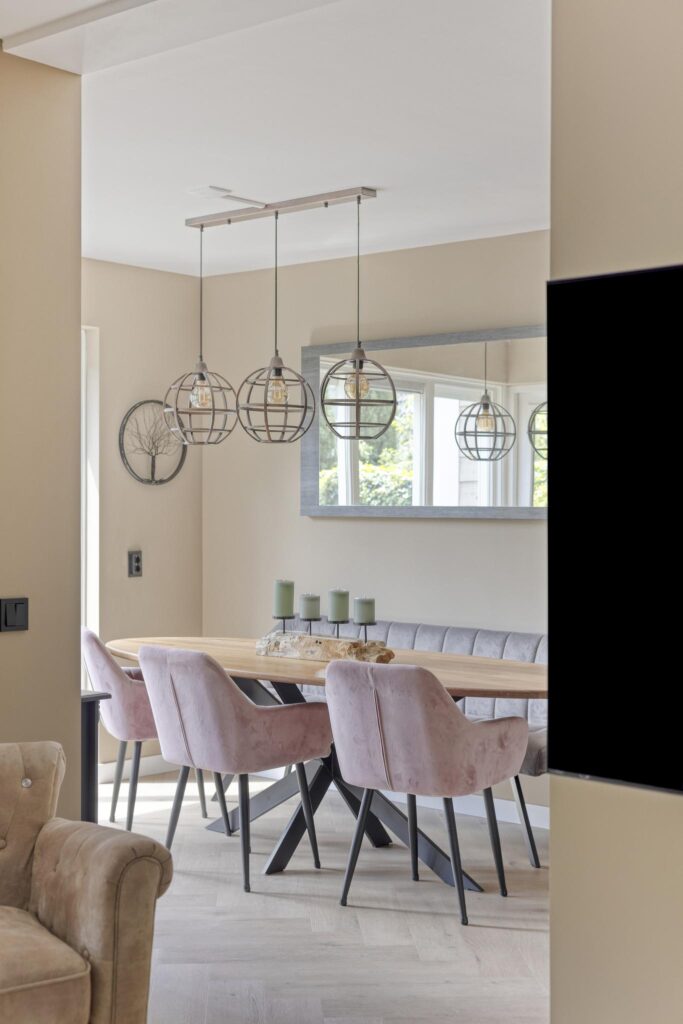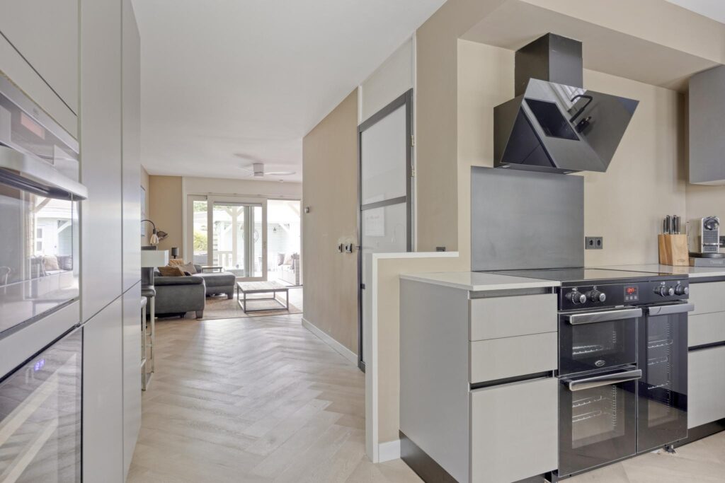 Via de eigen oprit bereik je de entree. De hal is voorzien van de 3-fasen meterkast, het moderne toilet, de trapopgang, loopdeur richting de garage en een stijlvolle taatsdeur die toegang geeft tot de leefruimte. De woonkamer wordt rijkelijk verlicht door de grote schuifpui richting de achtertuin, en is voorzien van een prachtige visgraat pvc-vloer met vloerverwarming. Er is genoeg ruimte voor een sfeervolle zithoek bij de pelletkachel, en in de aangrenzende eetkamer plaats je eenvoudig een grote eethoek, perfect voor lange avonden tafelen. De open keuken is gelegen aan de voorzijde en ingericht met een moderne hoekopstelling en een kastenwand. De keuken is voorzien van een composiet werkblad en uitgerust met luxe apparatuur, zoals het prachtige Belling inductie fornuis met maar liefst 3 ovens, een afzuigkap, Quooker Cube (kokend, heet, bruisend en koud water), vaatwasser, combi-oven, koel-/vriescombinatie en een wijnklimaatkast met twee klimaatzones.