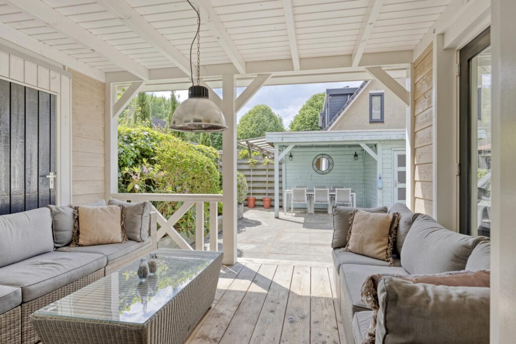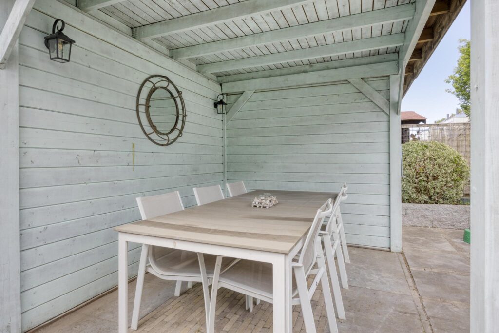 Aan de voorzijde beschik je over een nette voortuin, parkeergelegenheid op eigen terrein met laadpaalaansluiting voor elektrische auto’s, en toegang tot de inpandige garage met elektrische overheaddeur. De zonnige achtertuin is verzorgd aangelegd met grote tegels, groenborders én twee overkappingen. Direct aan de woning bevindt zich een sfeervolle houten veranda waar je heerlijk overdekt kunt loungen. Achter in de tuin staat een ruime houten berging met extra overkapping, ideaal voor hobby’s of opslag, en er is een praktische achterom. Dankzij de ligging op het zuidwesten geniet je hier volop van de middag- en avondzon.