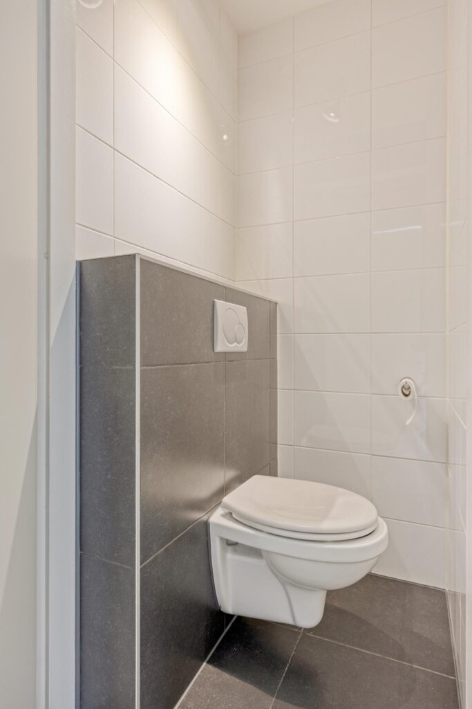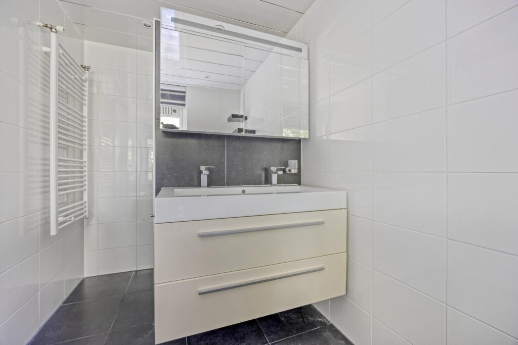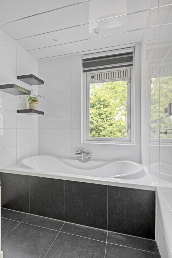 Op de eerste verdieping bevinden zich de badkamer, separaat toilet en drie ruime slaapkamers. De hoofdslaapkamer aan de achterzijde is voorzien van airconditioning, en alle kamers zijn netjes afgewerkt met een laminaatvloer. De badkamer is modern en stijlvol ingericht met een ligbad, aparte douche, wastafelmeubel met dubbele kraan, designradiator en een groot raam voor natuurlijk daglicht en ventilatie.