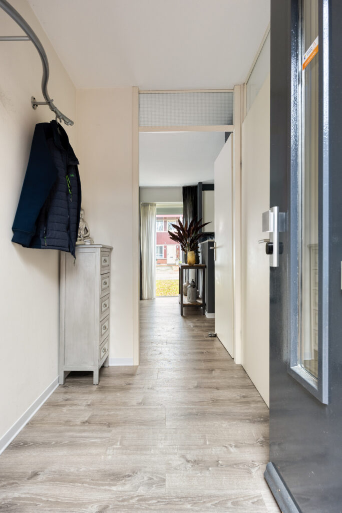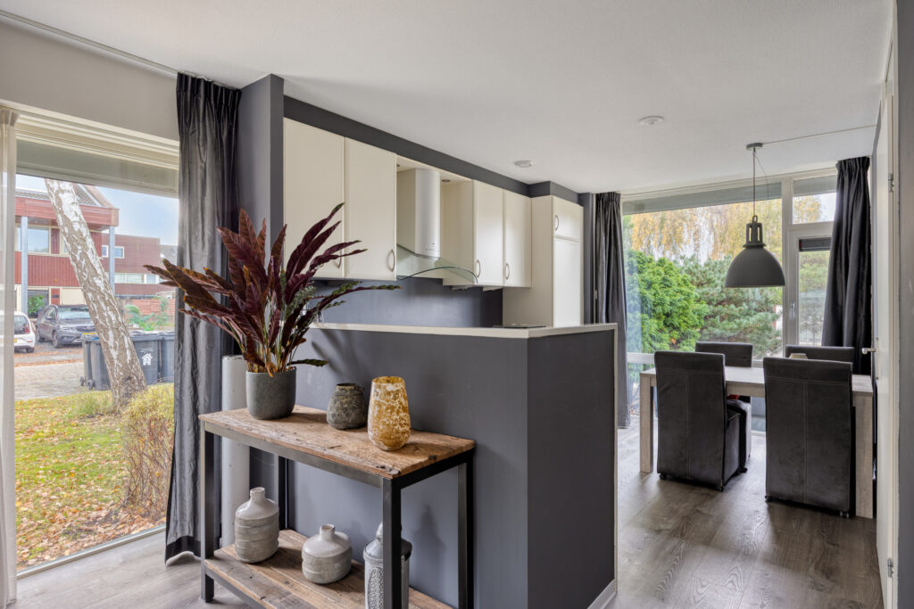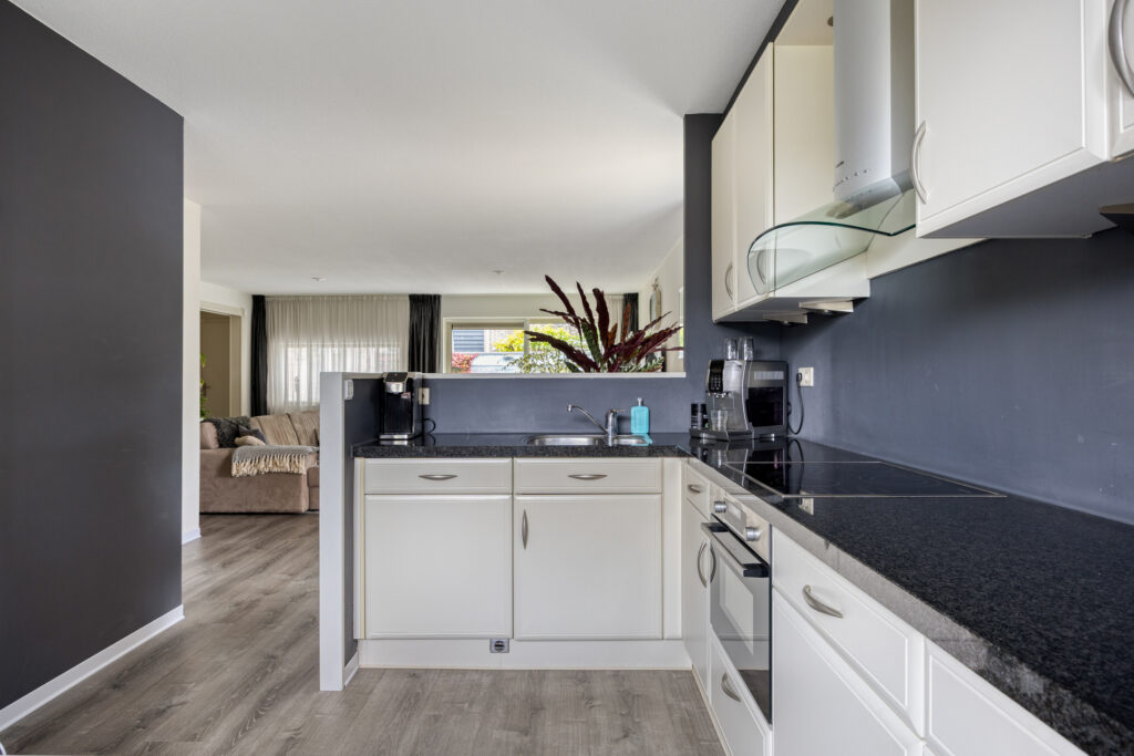 Via de carport stap je binnen in de hal met ruimte voor een garderobe, toiletruimte en toegang tot de woonkamer. De ruime living heeft een lichte laminaatvloer, grote raampartijen en een schuifpui die zorgt voor een directe verbinding met de tuin. De open keuken aan de voorzijde is ingericht in lichte en contrasterende tinten, en voorzien van moderne inbouwapparatuur, waaronder een elektrische kookplaat, afzuigkap, oven en koel-/vriescombinatie. De eethoek ligt gezellig bij het raam met zicht op de voortuin.
