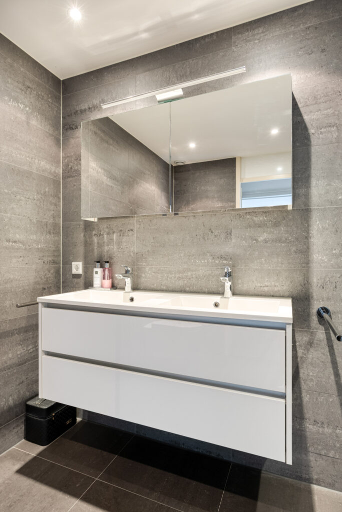 Vanuit de woonkamer bereik je de gang naar de slaapkamers en de badkamer. Beide slaapkamers zijn royaal van formaat; de grootste heeft een schuifpui naar het terras, de tweede kamer is ideaal als werkkamer of logeerruimte. De badkamer is modern afgewerkt met grote betonlook tegels, een inloop regendouche, wastafelmeubel met dubbele kraan en een tweede toilet.