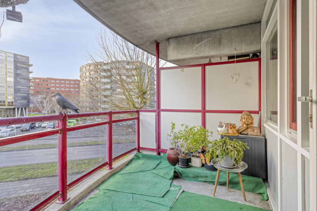 Via de woonkamer bereik je het balkon, waardoor je eenvoudig even naar buiten stapt. Het overdekte balkon is een fijne verlenging van de woonkamer en biedt ruimte voor een zitje en wat groen. Een plek waar je ’s ochtends rustig kunt starten met een kop koffie of aan het eind van de dag even buiten zit om te ontspannen.