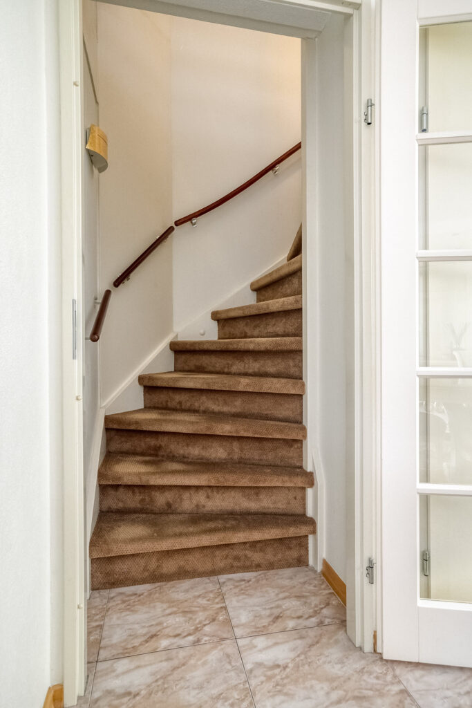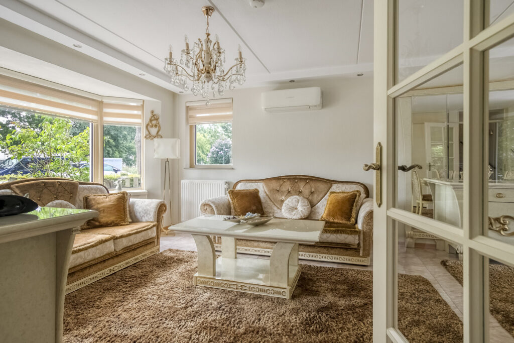 Via de overdekte entree stap je binnen in de hal met garderobe en het toilet. De woonkamer voelt direct ruim en licht, mede dankzij de erker aan de voorzijde en de schuifpui richting de tuin. De vloer is voorzien van plavuizen, er is airconditioning en de wanden zijn licht afgewerkt, waardoor de kamer nog ruimer oogt. Aan de achterzijde vind je de open keuken voorzien van een meubel in een U-opstelling, met een schiereiland met ontbijtbar, en een kastenwand. De keuken is uitgevoerd met lichte fronten en een stijlvol werkblad. Je kookt hier op een inductiekookplaat en hebt de beschikking over een afzuigkap, dubbele combi-oven, vaatwasser en een grote Amerikaanse koelkast. Dankzij de bar kun je koken en gezellig bijpraten tegelijk. Vanuit de woonkamer bereik je de trapopgang, en er is een trapkast aanwezig voor je voorraadopslag.