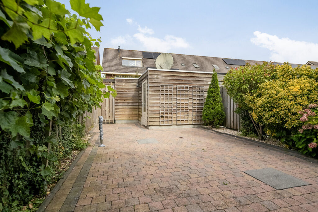 De achtertuin is onderhoudsvriendelijk aangelegd met sierbestrating en beplante borders. Door de gunstige ligging geniet je volop van de zon. Het terras biedt genoeg ruimte voor kinderen om te spelen en voor een loungeset of een grote eettafel, ideaal voor gezellige avonden met familie of vrienden. Achter in de tuin staat een vrijstaande berging voor fietsen of tuingereedschap, en via de achterom bereik je eenvoudig de straat. Ook de voortuin geeft extra privacy dankzij de groene erfafscheiding.